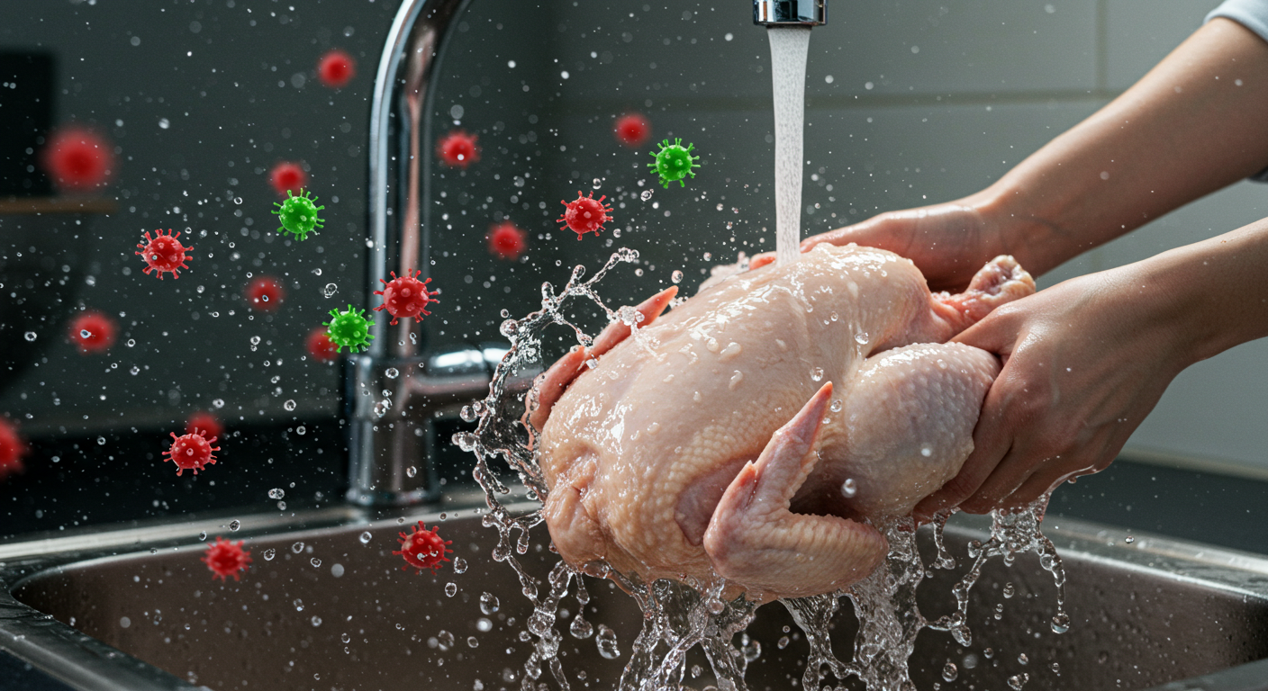 Ou seja: lavar o frango não limpa — contamina.