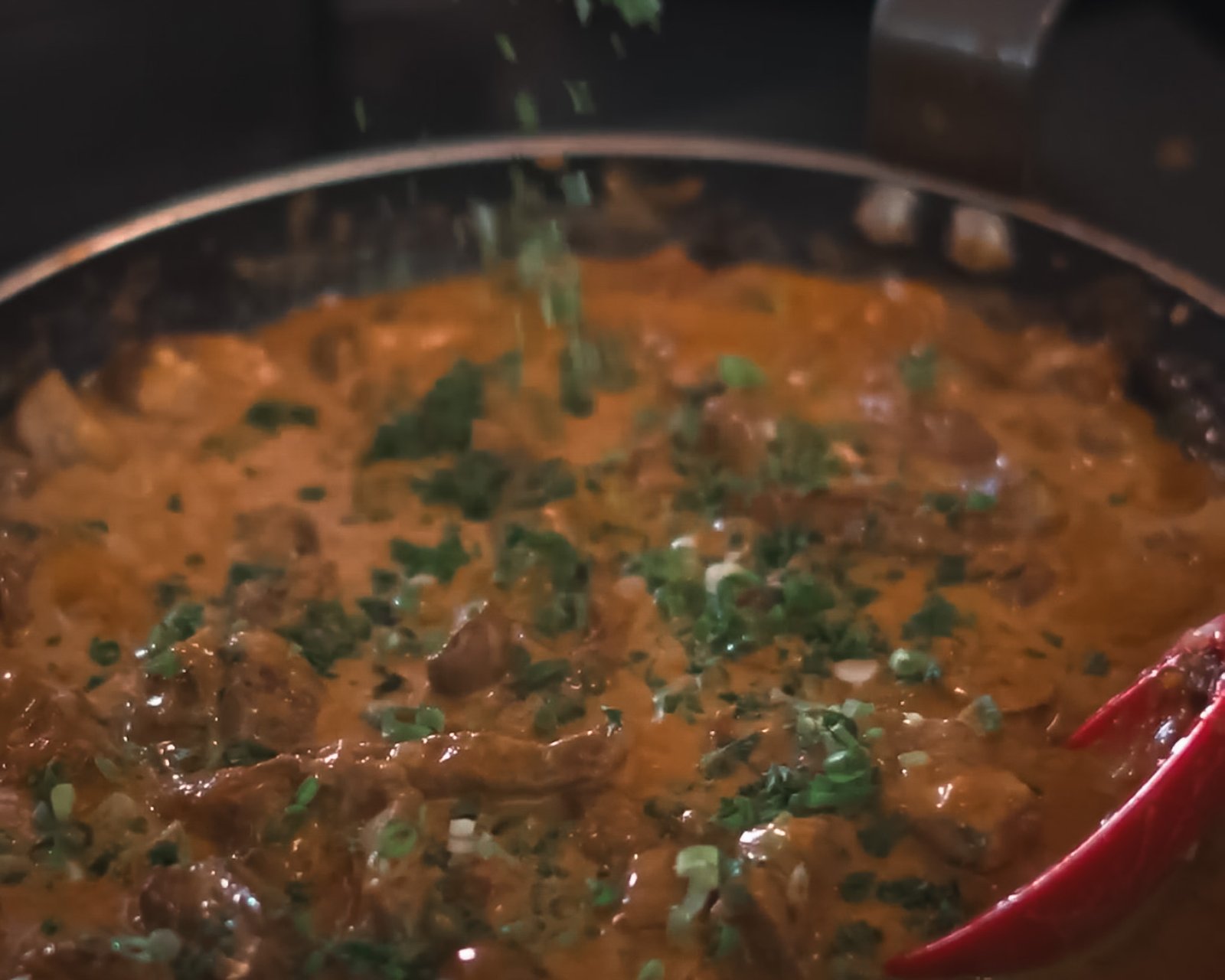 Tempere com sal e pimenta-do-reino a gosto. Desligue o fogo e então finalize com ciboulette e salsinha picadas para dar frescor ao prato e quando aprender como fazer strogonoff de carne, ajuste os temperos.